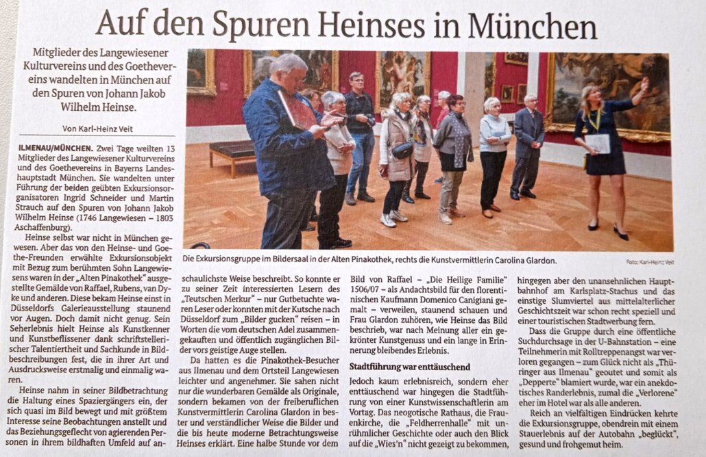 Innerhalb der seit längerer Zeit währenden inhaltlichen Zusammenarbeit zwischen dem Goetheverein Ilmenau/ Stützerbach, jetzt Goethegesellschaft, und dem Kultur- und Brauchtumsverein Langewiesen, reisten 14 Mitglieder derselben in Sachen Johann Jac. Wilhelm Heinse für zwei Tage in die bayerische Hauptstadt.